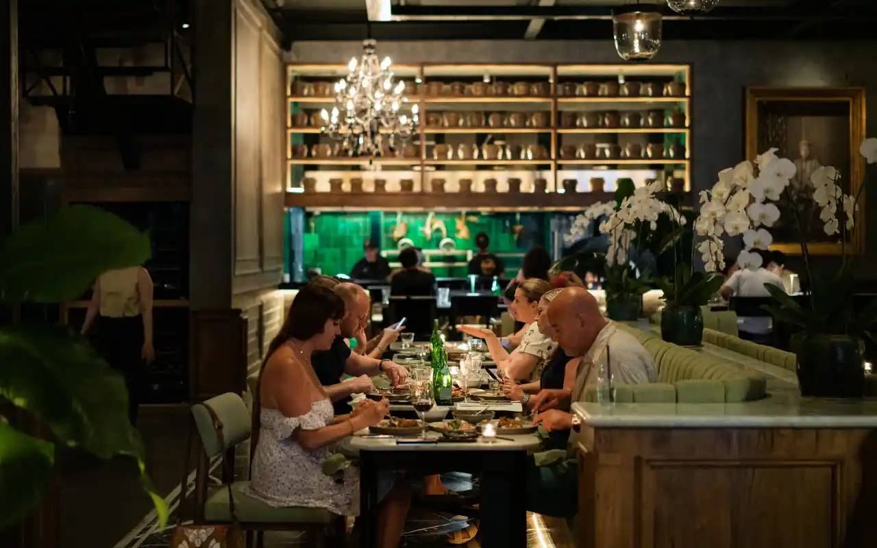 Widely regarded as the best Asian restaurant in Seminyak, Mama San blends rich flavours, bold design, and timeless charm. With over a decade of history, the tried-and-true Bali icon has welcomed generations of family by stitching a patchwork in seamlessly melding the lively essence of street food with a refined dining experience that offers a menu that spans the rich culinary landscapes of South East Asia. The restaurant’s interior, inspired by the opulence of 1920s Shanghai, features plush green banquette seating, dark timber walls, and elegant chandeliers, composing a sophisticated yet warm atmosphere.